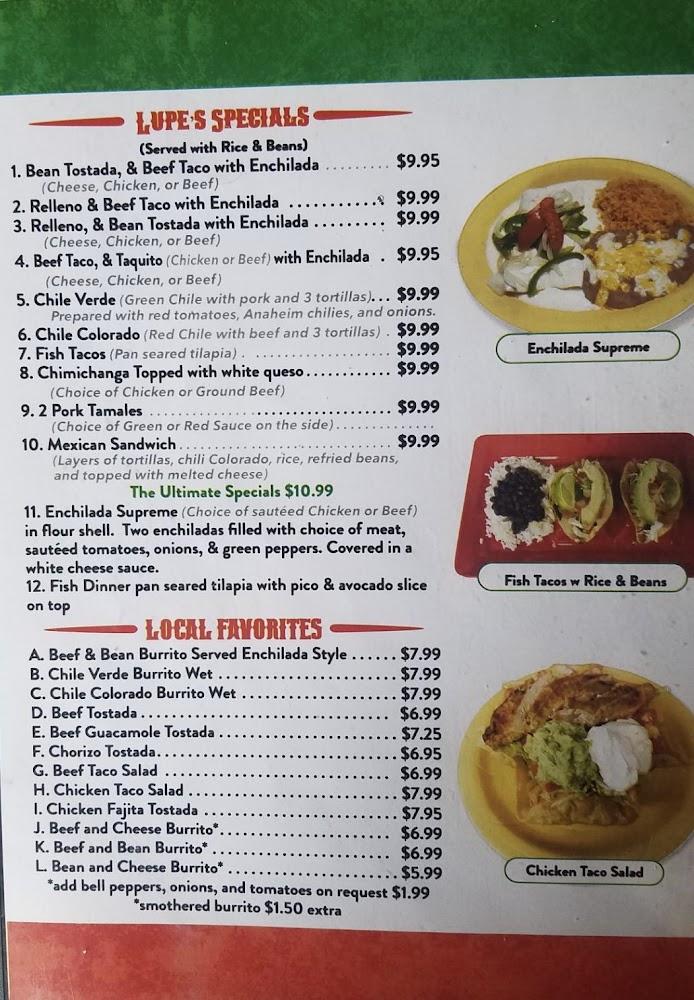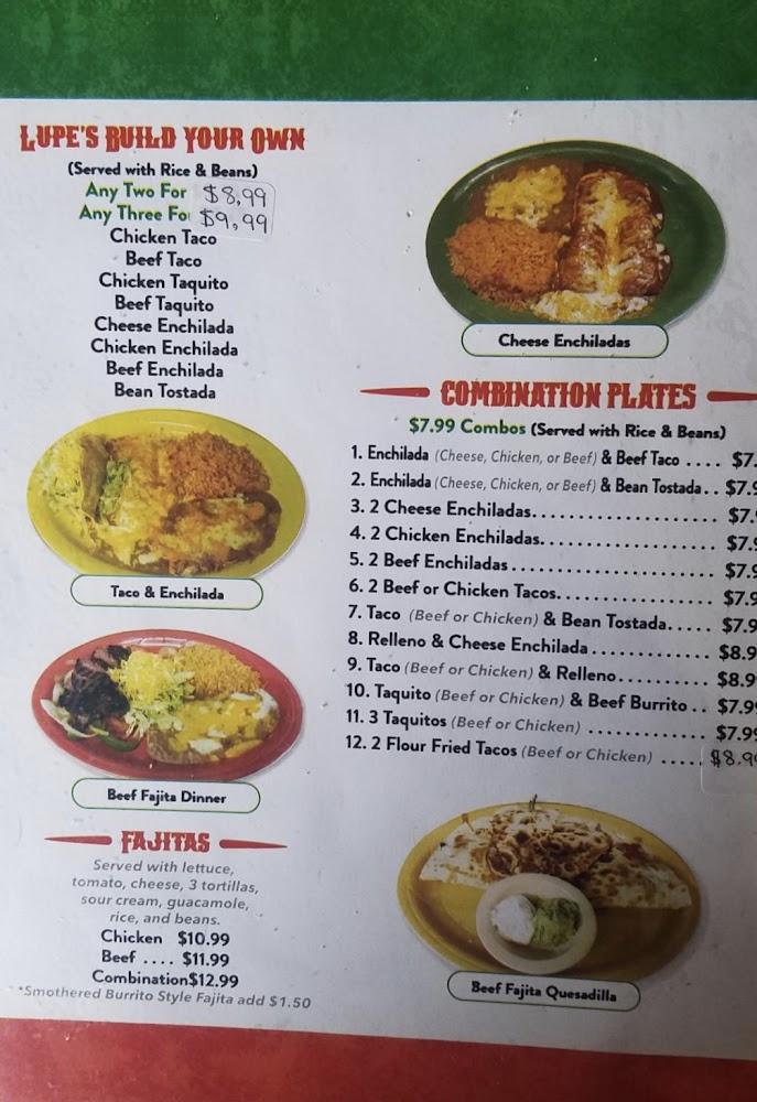 Lupe's menu features 108 delicious items, catering to various tastes. Signature dishes include combinations like tacos, enchiladas, and burritos, often served with robust, homemade sauces.